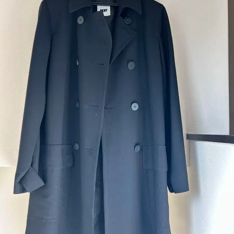DYNY의 코트입니다. 색상은 블랙이며, 얇은 소재이지만 울 100%로 따뜻합니다. 툭 떨어지는 실루엣이 예쁩니다. 약간의 착용감이 있지만, 여전히 예쁘게 입으실 수 있을 거라고 생각합니다.