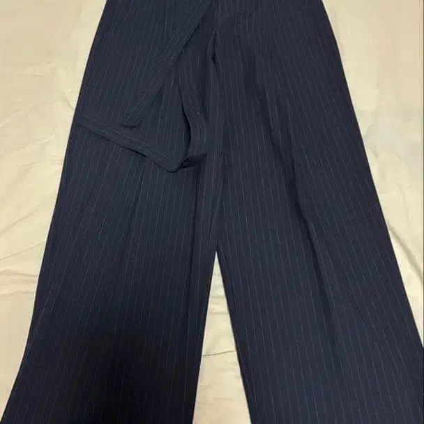 ZARA의 스트라이프 슬랙스입니다. 와이드 스트레이트 핏입니다. 색상은 짙은 네이비입니다. 리본 끈이 달려있지만, 탈부착 가능합니다. 사이즈가 조금 커서 판매합니다.