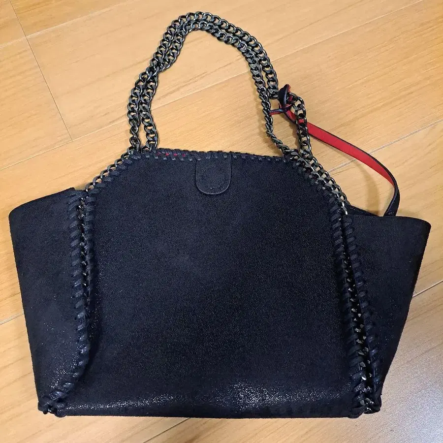 자동 번역되었어요. 원문보기검은색 스웨이드 소재에 체인 스트랩과 빨간색 악센트가 특징인 캐주얼 토트형 핸드백입니다.