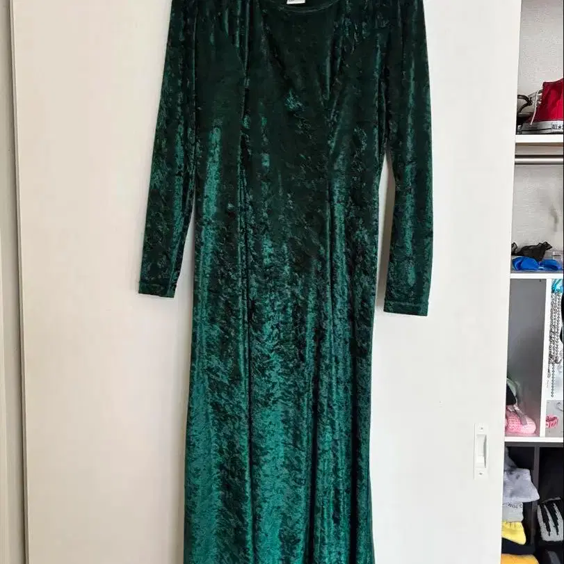 깊은 그린 색상의 벨로아 원단으로, 햇빛이나 조명의 밝기, 움직임에 따라 벨로아가 빛나며 명도가 변하는 멋진 드레스입니다.