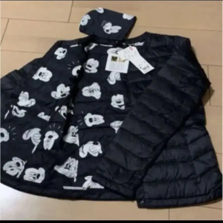 미키마우스 패턴 안감의 경량 다운 자켓.