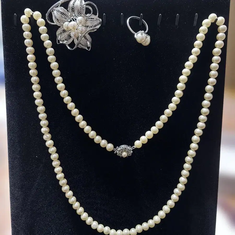 진주 목걸이 브로치 반지 싱글 볼 0.5cm 변색, 노후화가 있어 저렴하게 판매합니다.