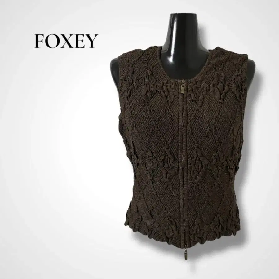 FOXEY 브라운 실크 더블 지퍼 슬리브리스 베스트 셔링