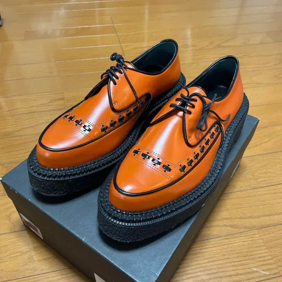 ADIEV 아듀의 크레이프솔 크리퍼 슈즈입니다. 조지 콕스를 연상시키는 뜨개질 스트레이트 팁의 러버 솔입니다. 정가 74,000엔 사이즈 40 블랙 x 오렌지