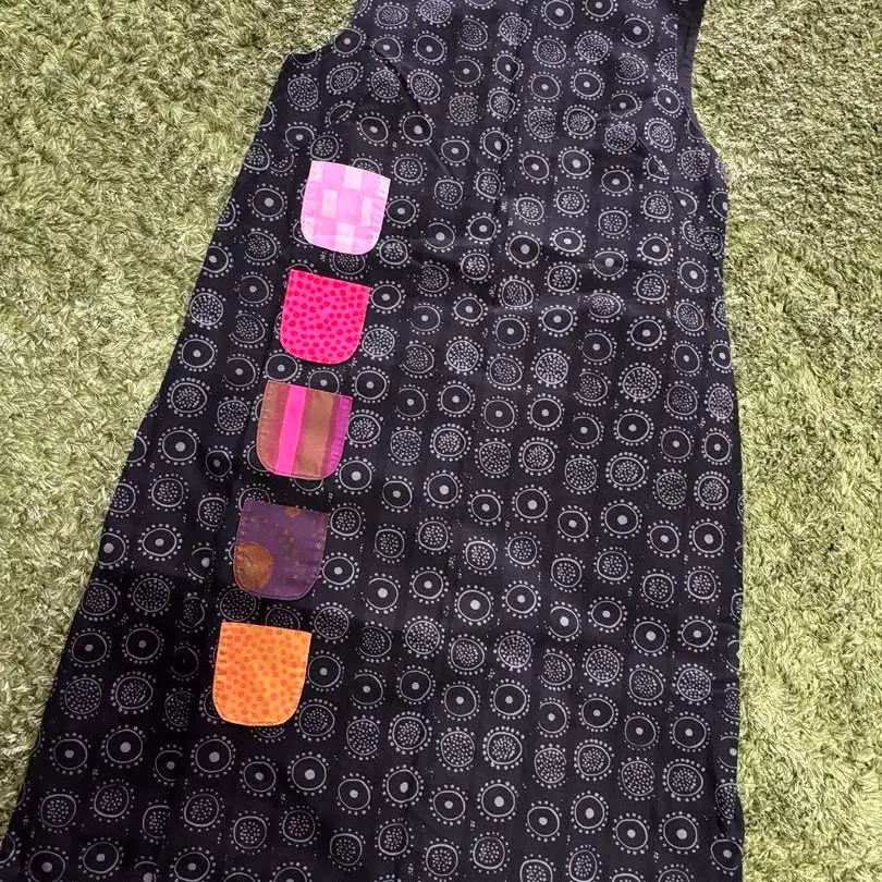 블랙 베이스에 원형 무늬와 다채로운 포켓 디자인의 슬리브리스 원피스. - 색상: 블랙 - 디자인: 원형 무늬 - 포켓 개수: 5개 - 포켓 색상: 핑크 계열 - 포켓 디자인: 다른 패턴 방문해 주셔서 감사합니다. 마리메꼬의 해피 드레스 슬리브리스 version입니다. 가을/겨울에는 터틀넥 등 이너와 함께 착용해도 귀엽습니다. 몇 번 착용했지만 아직 깨끗합니다. 주관적인 의견이며, 중고품임을 이해해 주시고 잘 부탁드립니다.