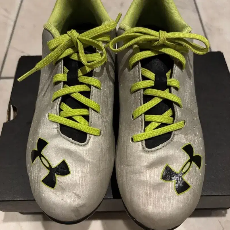 실버와 라임의 배색이 특징인 Under Armour 축구화. 1회 착용 후, 집에서 빛을 피해 보관했습니다. - 브랜드: Under Armour - 색상: 실버/라임 - 스타일: 축구화