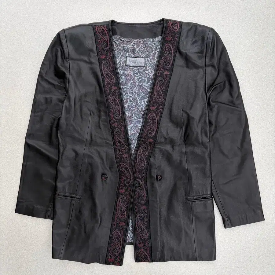 노카라 디자인에 페이즐리 자수 블레이드를 더한 가죽 자켓.