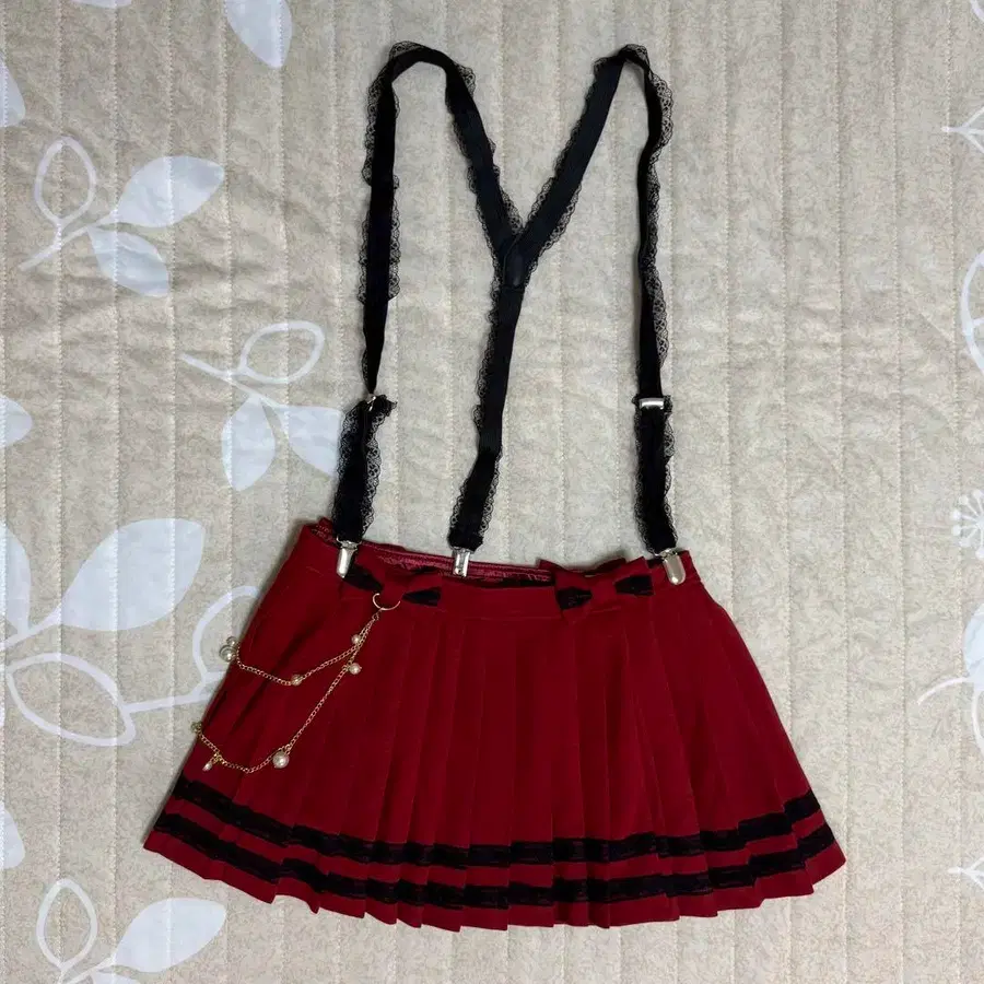 레이스 달린 서스펜더와 펄 체인이 특징인 빨간색 플리츠 스커트.