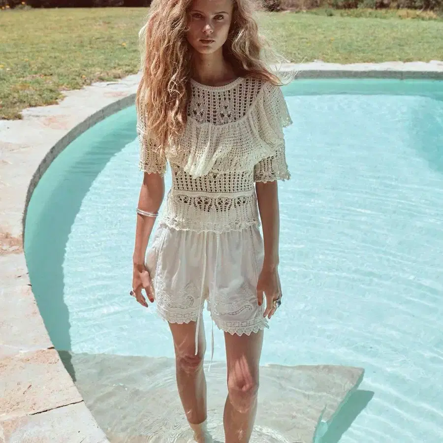 레이스 소재의 로맨틱한 반팔 상의, 프릴 디자인이 특징입니다. - 색상: 화이트 - 스타일: 로맨틱 - 소매 길이: 반팔 - 디자인: 프릴 방문해 주셔서 감사합니다.