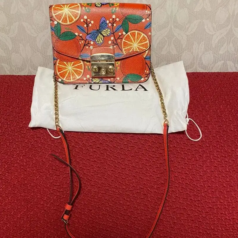 선명한 오렌지 컬러의 나비와 후르츠 프린트가 특징인 FURLA 숄더백. - 브랜드: FURLA - 디자인: 오렌지와 나비 프린트 - 스트랩 타입: 체인 스트랩 - 색상: 오렌지 - 소재: 가죽 느낌 소재 방문해 주셔서 감사합니다. 컬러 - 오렌지 계열 소재 - 천연 가죽 부속품 - 보증서