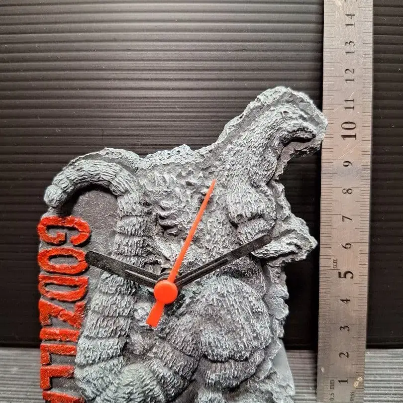 고질라 디자인이 특징인 시계로, 오렌지색 바늘이 악센트가 되어 있습니다. - 모델: 고질라 시계 - 색상: 그레이 - 문자: GODZILLA - 바늘 색상: 오렌지 - 사이즈: 약 10cm AA 배터리 1개로 작동 판매를 위해 배터리를 넣어 작동 확인했습니다. 배터리는 부속되지 않습니다. 오래된 물건입니다. 장기간 자택 보관품임을 이해하신 후 구매 부탁드립니다.