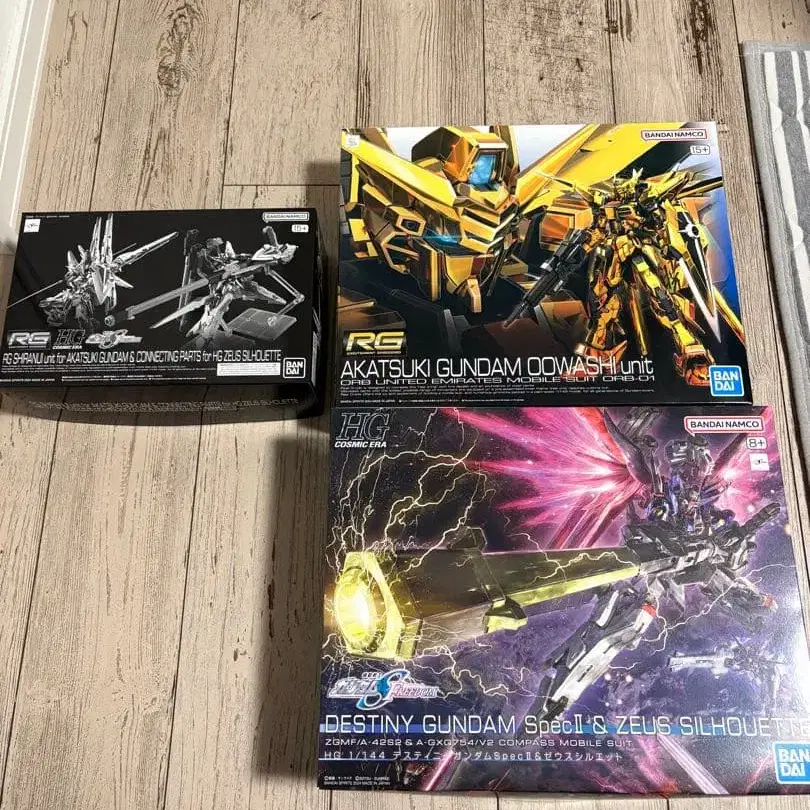 RG 아카츠키 건담 + RG 아카츠키 건담용 시라누이 팩 + HG 데스티니 건담 SpecII & 제우스 실루엣 3종 세트 낱개 판매 불가. 미개봉 새상품.