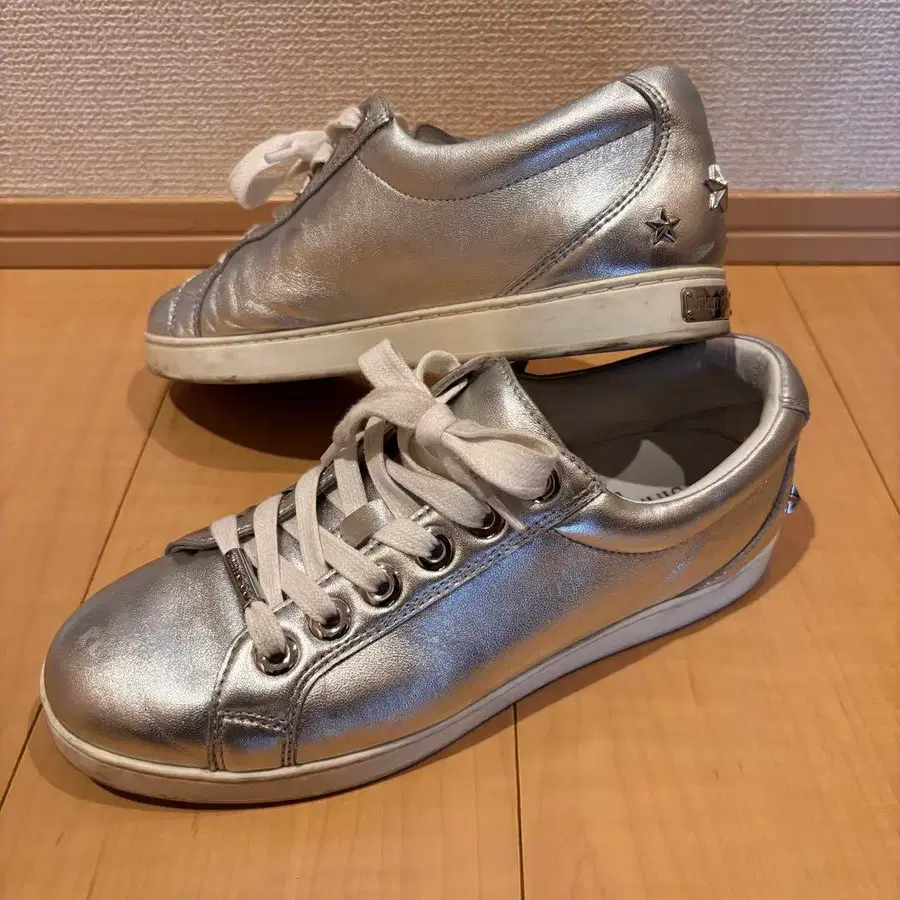 [ 상품명 ] JIMMY CHOO 지미추 스타 스터드 로고 금장 장식 가죽 스니커즈 실버 은색 여성용 스니커즈 [ 색상 ] 실버 은색 [ 사이즈 ] 24cm [ 컨디션 ] ○ 상태: B <상태 상세표> S 새상품 A 사용감이 적고, 좋은 상태의 상품 B 사용감은 있지만, 흠집이나 얼룩이 적은 상품 C 사용감 외에, 흠집이나 얼룩이 보이는 상품 D 상당히 큰 데미지가 보이는 상품