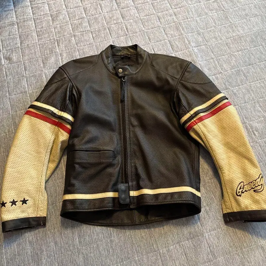메쉬 소재의 바이커용 자켓, 별 자수 포함. - 브랜드: Greedy - 색상: 블랙/화이트 - 소재: 소가죽 - 특징: 소매 부분은 지퍼로 입고 벗기 가능 - 스타일: 바이커용 자켓 방문해 주셔서 감사합니다. 구제 의류이므로 이해하신 후 구매 부탁드립니다. 가죽 소재 - 소가죽 색상 - 블랙 계열