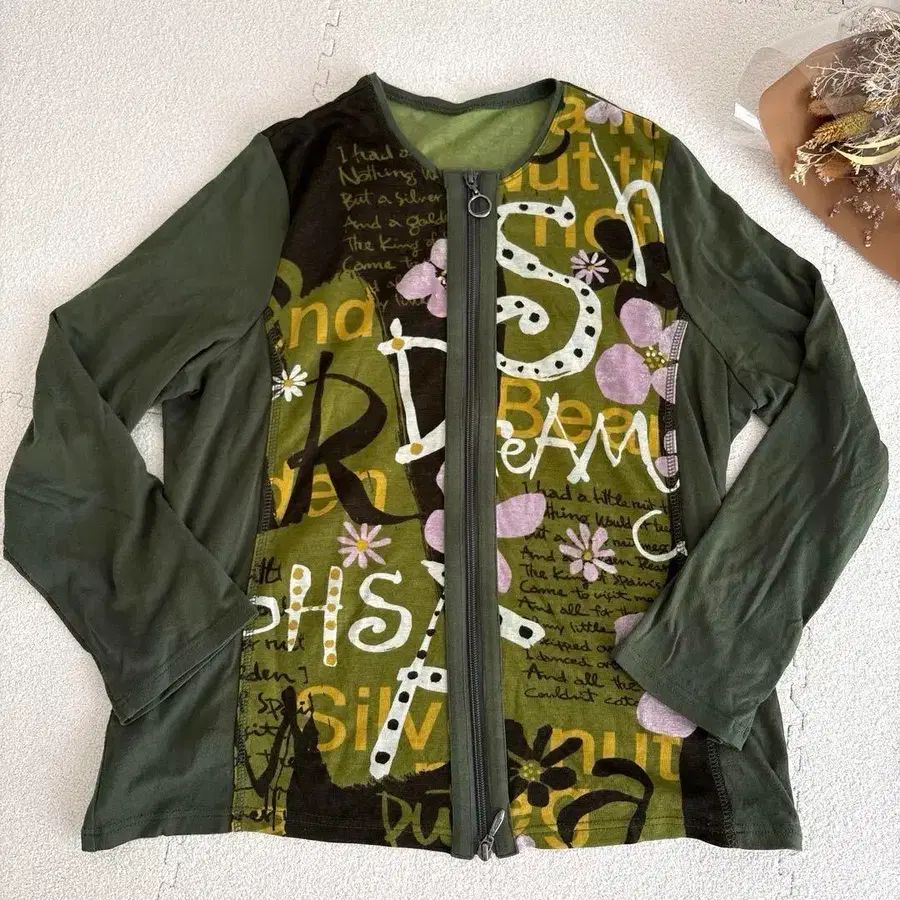 y2k 개성있는 꽃무늬 프린트 올리브 그린 집업 가디건 긴팔