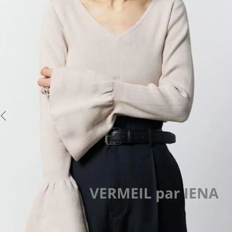 리브 편직의 베이지 V넥 스웨터, 플레어 슬리브 디자인으로 캐주얼한 스타일에 최적입니다.