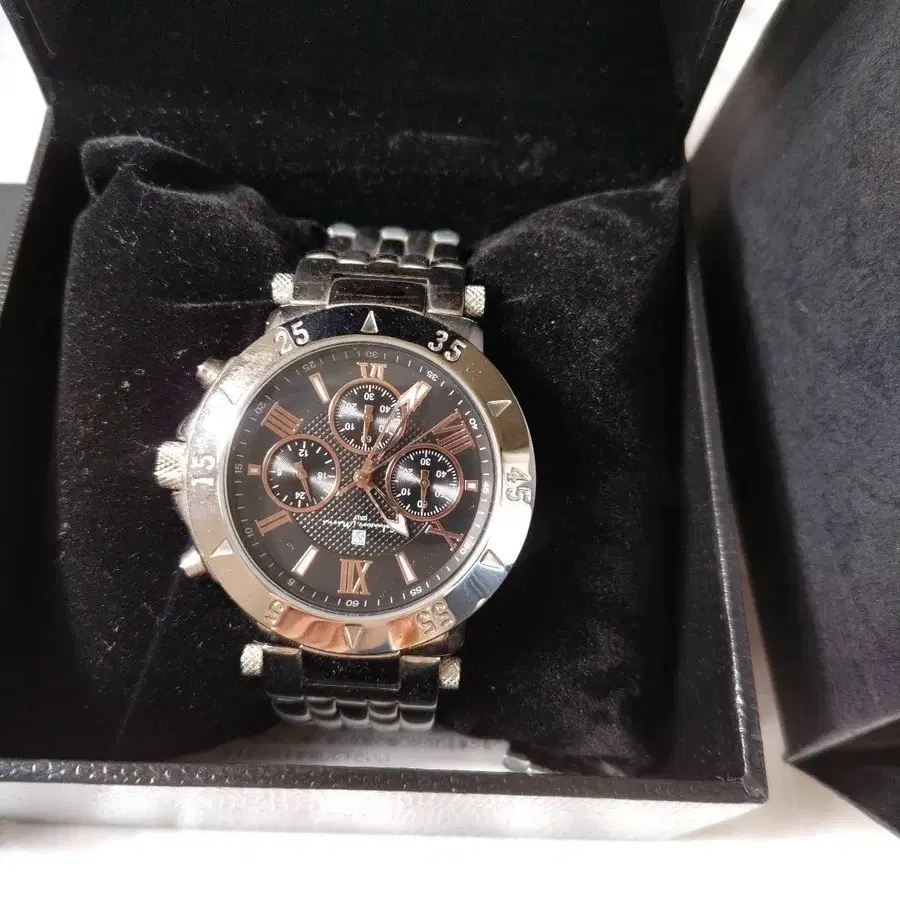 크로노그래프 기능을 갖춘 블랙과 실버 색상의 손목시계, 10주년 기념 모델. - 브랜드: Salvatore Marra - 모델: 10th Anniversary - 색상: 블랙/실버 - 소재: 스테인리스 스틸 - 기능: 크로노그래프 - 부속품: 보증서 - 케이스 사이즈: 약 40mm 방문해 주셔서 감사합니다. 아들이 구매 후 보관하고 있었습니다. 1~2회 사용했습니다. 특별한 흠집이나 얼룩은 없습니다.