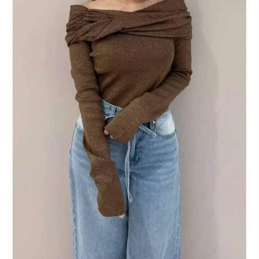 가슴 부분의 드레이프 라인이 아름다운, 드레스 같은 오프숄더 니트입니다.