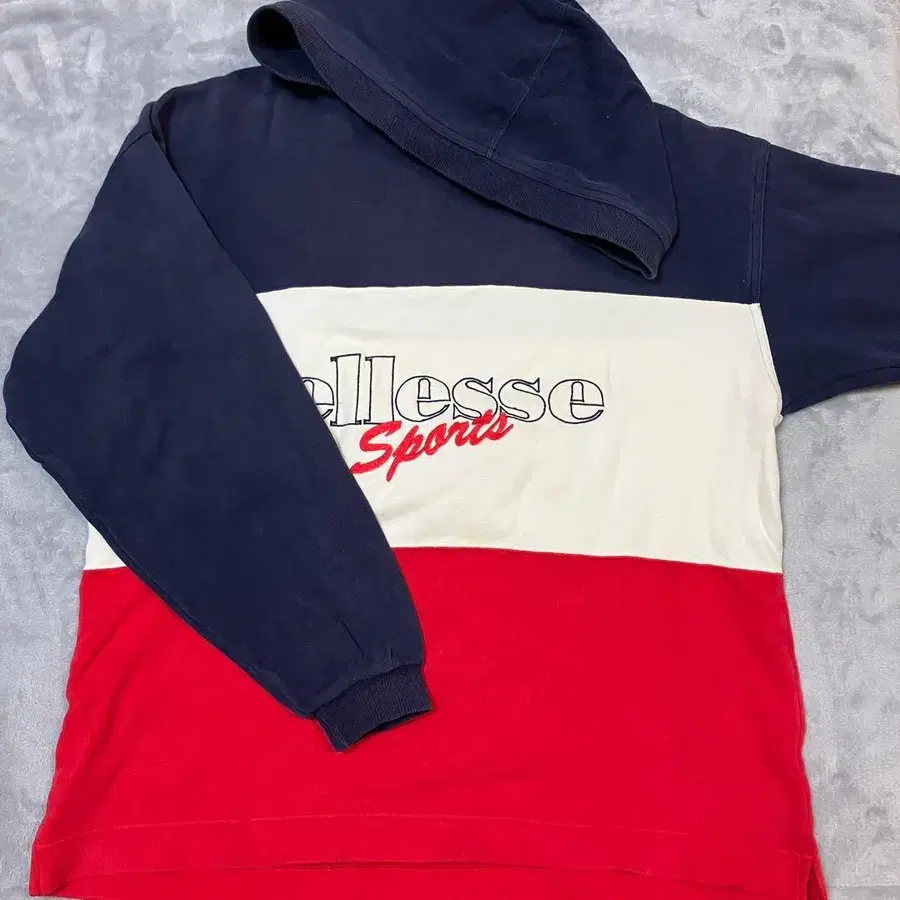 ellesse의 후드 부착 후드티, 네이비와 레드의 컬러 블록 디자인.