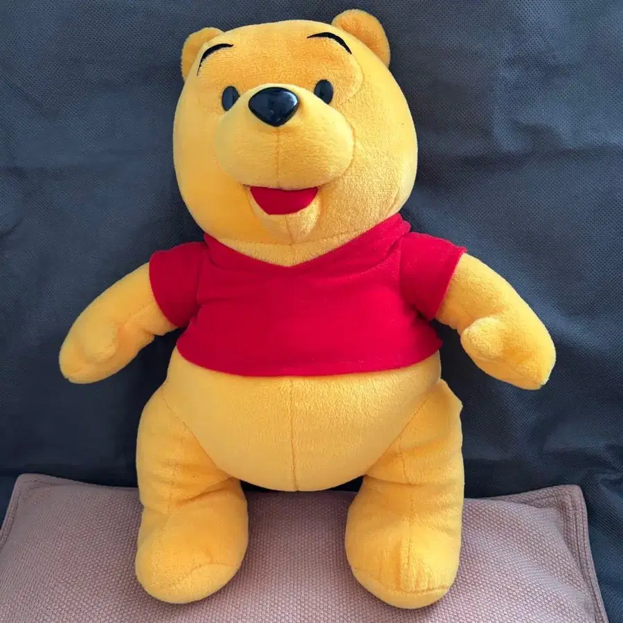 곰돌이 푸 봉제 인형, 약 35cm 사이즈. 빨간색 셔츠를 입고 있습니다.
