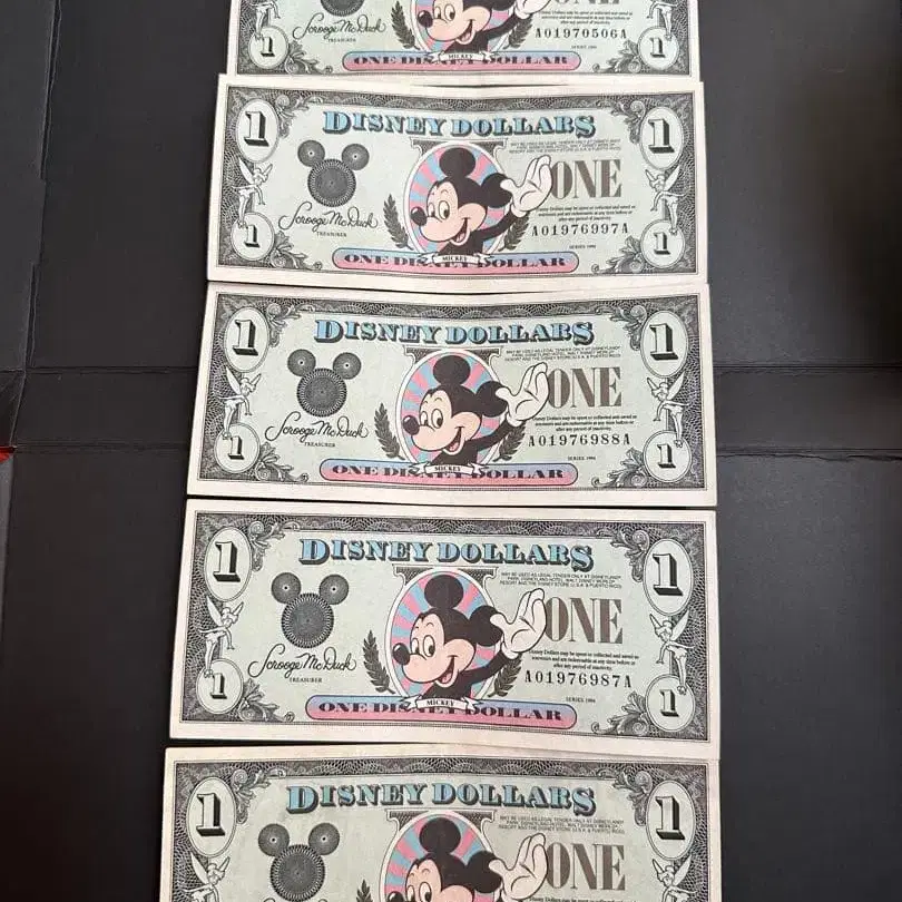 1994년 미키마우스와 신데렐라 성 디자인이 적용된 디즈니 달러 5장 세트. - 종류: 디즈니 달러 - 액면가: 1달러 - 디자인: 미키마우스 - 디자인: 신데렐라 성 - 제조자: 조지 맥도날드 - 수량: 5장 세트 31년 전임을 감안하면 깔끔한 편이라고 생각합니다. 상태는 사진을 참고해 주세요. 잘 부탁드립니다.
