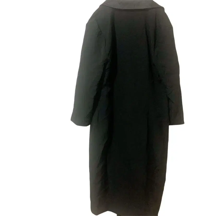 광택감 있는 블랙 더블 브레스트 롱 코트, 플리츠 디자인이 특징입니다.