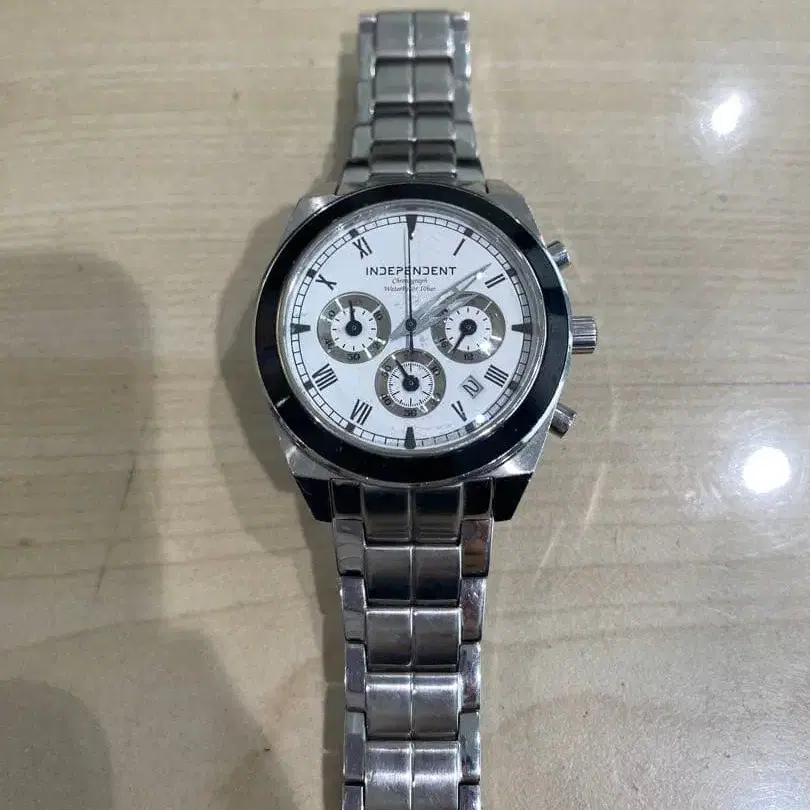 양도받은 물건입니다. 화이트 다이얼의 스테인리스 스틸 소재 쿼츠 손목시계, 10기압 방수. - 브랜드: INDEPENDENT - 색상: 화이트 - 케이스 소재: 스테인리스 스틸 - 방수 성능: 10기압 - 제조국: 중국 - 특기사항: 버튼에 작은 흠집 있음 방문해 주셔서 감사합니다.