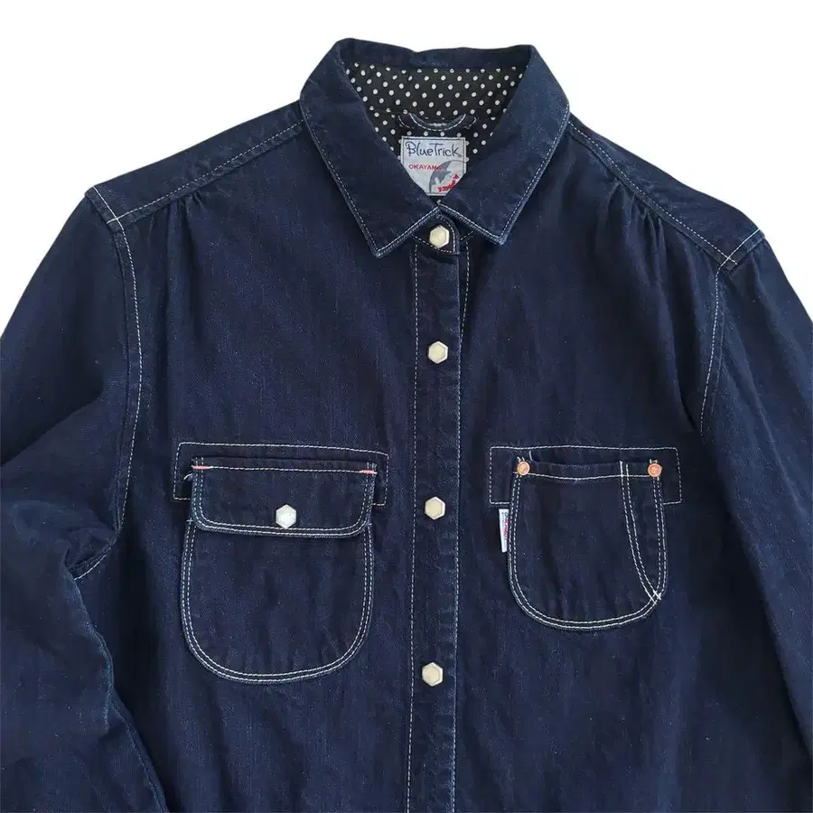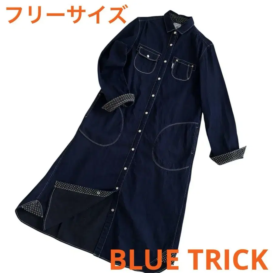 블루 트릭 데님 롱 원피스 안감 도트 다크 블루 겉옷