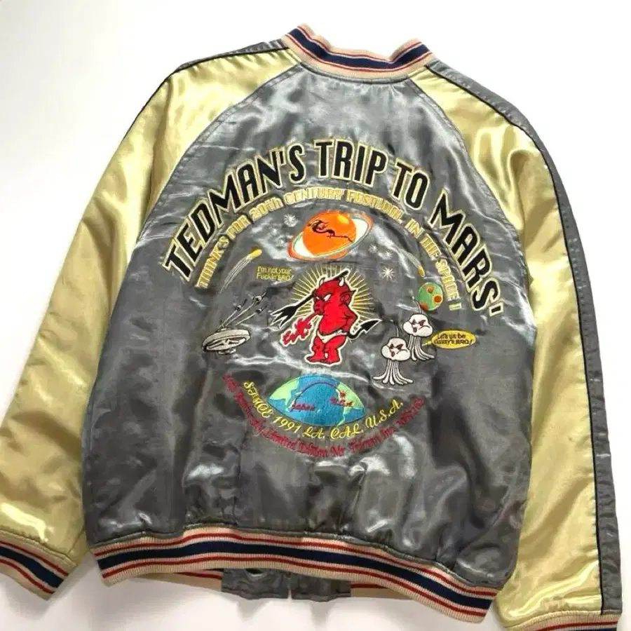 뒷면에는 테드맨다운 캐릭터 자수를 대담하게 배치했습니다. 표면은 고급스러운 그레이 베이스에 빈티지 느낌의 광택 새틴 느낌이며, 뒷면은 골드 퀼팅으로 코디에 따라 인상을 자유롭게 체인지할 수 있습니다.