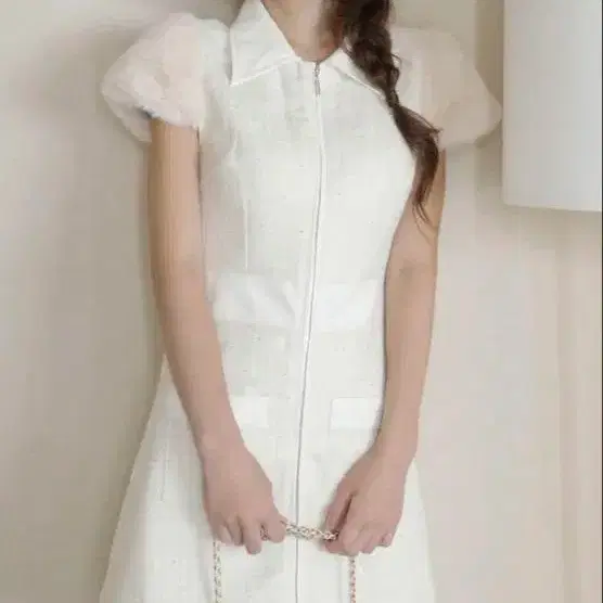 봉투에서는 꺼냈지만, 택 포함 미사용 새상품입니다! 사이즈가 맞지 않아 판매합니다. Design] 입체적인 실루엣과 다른 소재의 조합이 눈길을 끄는 미니 원피스입니다. 복슬복슬한 퍼 소매가 귀엽고 화려한 인상을 더합니다. 옷깃은 탈부착 가능하여 분위기를 바꿔 2way로 착용할 수 있습니다. 전체적으로 사용된 트위드 소재에는 반짝이는 라메가 짜여 있어 고급스러운 화려함을 연출합니다. 허리 부분의 절개와 큰 포켓에는 인조 가죽이 사용되어 대비가 뚜렷한 디자인이 되었습니다. 프론트의 지퍼는 입고 벗기 편함과 디자인의 악센트를 양립시킵니다. [Styling] 하나만으로도 엘레강트한 스타일이 완성되는 원피스입니다. 옷깃을 달면 클래식하고 고급스러운 인상을 줍니다. 파티나 식사 모임 등 특별한 날 외출에 딱입니다. 옷깃을 제거하면 노카라의 깔끔한 디자인이 되어 평소에도 사용하기 좋습니다.