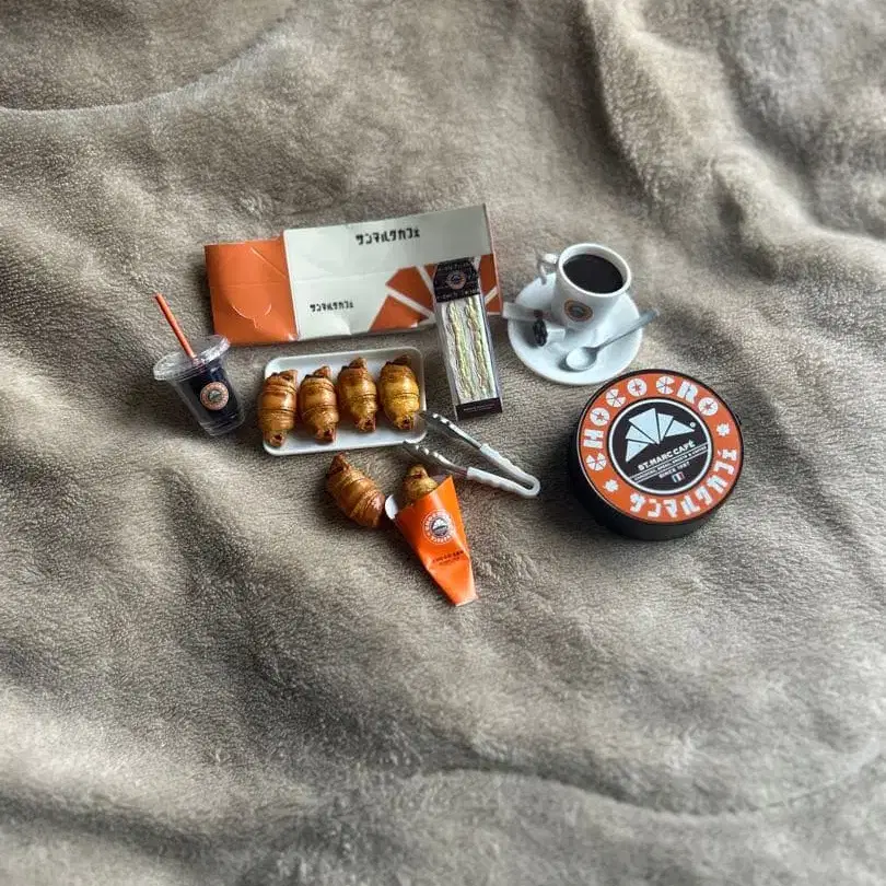 생마르크 카페 미니어처 세트, 크루아상과 커피가 포함된 귀여운 아이템. - 상품명: 생마르크 카페 미니어처 세트 - 내용물: 크루아상, 커피, 디저트, 트레이, 집게 - 디자인: 오렌지와 화이트 컬러 스킴, 로고 포함 - 사이즈: 미니어처 사이즈 방문해 주셔서 감사합니다.
