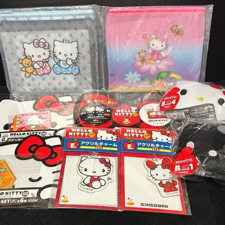 헬로키티 50주년 happy 복권 캔뱃지 세트 1점 아크릴 참 2점 스티커 세트 2점 플랫 파우치 2점 페이스 참 2점입니다. 모두 미개봉 상태로 어두운 곳에서 보관했습니다. 낱개 판매 불가. 자택 보관품이므로 신경 쓰이는 분은 구매를 자제해주세요!!!