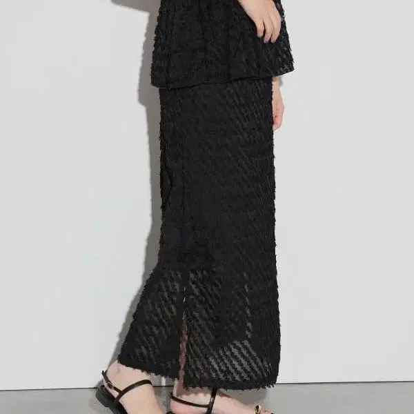 트렌디한 프린지 자카드 소재를 사용한 심플하고 화려한 내로우 스커트입니다. 섬세한 프린지가 입체감을 돋보이게 하여 여성스러움을 연출합니다.