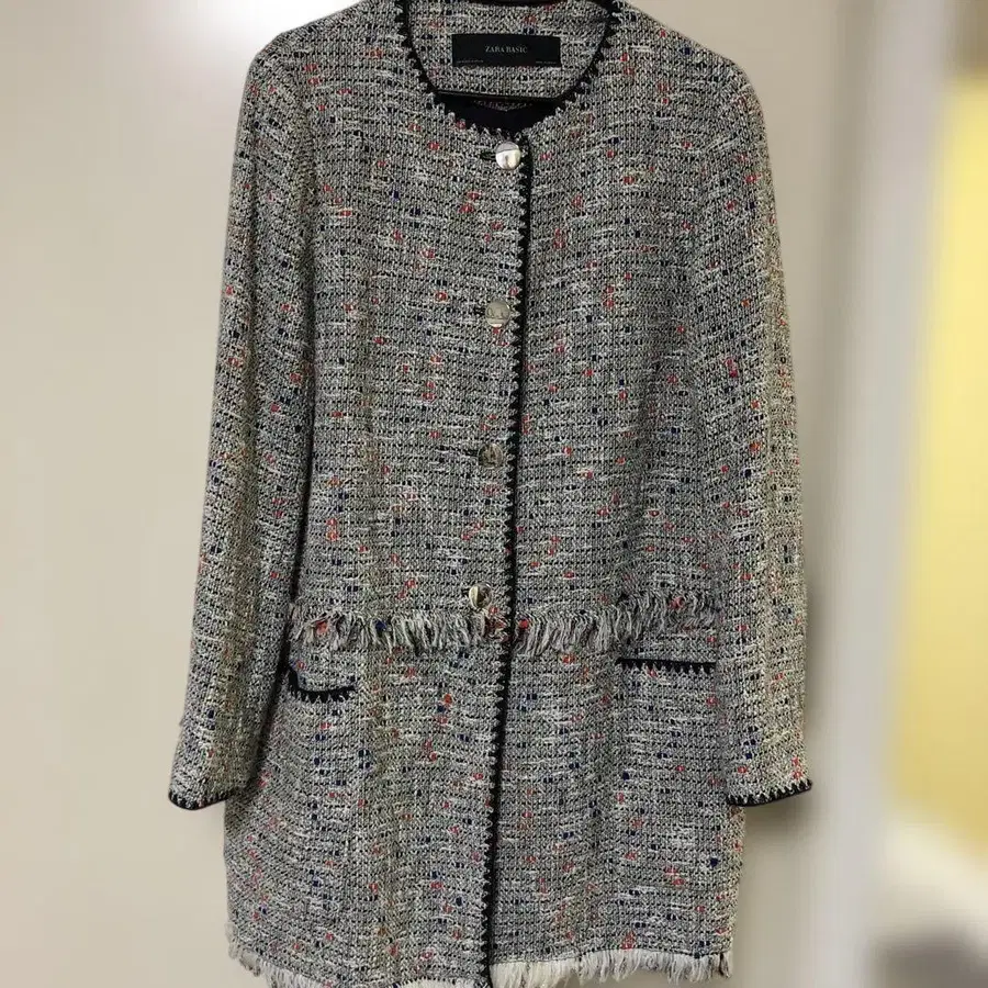 트위드 소재의 노카라 자켓입니다. 프린지 마감과 실버 버튼이 특징입니다. 어깨 너비 38 가슴 너비 50 기장 81 버튼은 실버 색상입니다. - 브랜드: ZARA BASIC - 디자인: 노카라 자켓 - 소재: 트위드 - 색상: 그레이 계열 (빨간색, 파란색 악센트) - 장식: 프린지 마감 - 버튼: 실버 버튼 소재 특성상 실의 약간의 볼록함이 있습니다. 방문해 주셔서 감사합니다.