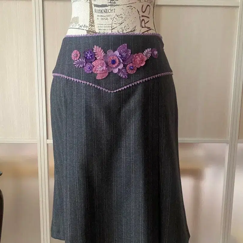 그레이 스트라이프 패턴에 매우 섬세한 꽃무늬 자수가 들어간 미디 스커트. - 색상: 그레이 - 장식: 꽃무늬 패치워크, 비즈 자수 - 소재: 울 - 스타일: 허리에 걸쳐 입는 느낌의 무릎 위 기장 스커트 - 디자인: 스트라이프 패턴 방문해 주셔서 감사합니다. 색상 - 그레이 계열 계절 - 가을/겨울 얼룩, 찢김, 냄새 등 - 없음
