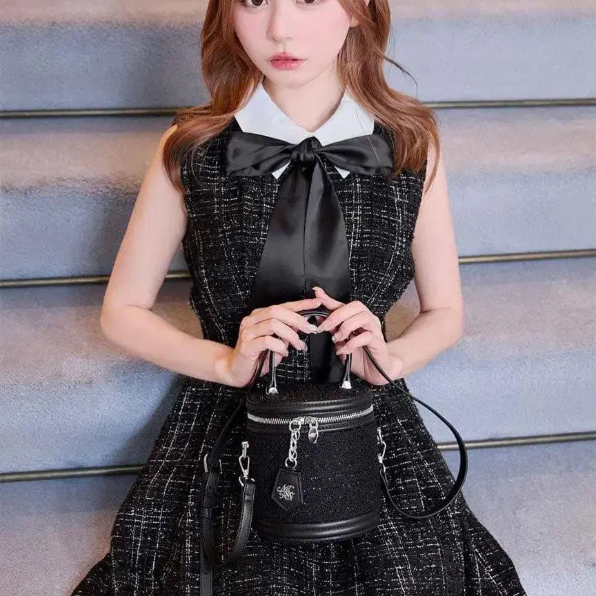 택 포함 새상품 미셸 마카롱 리본 트위드 미니 원피스 블랙 프리 사이즈