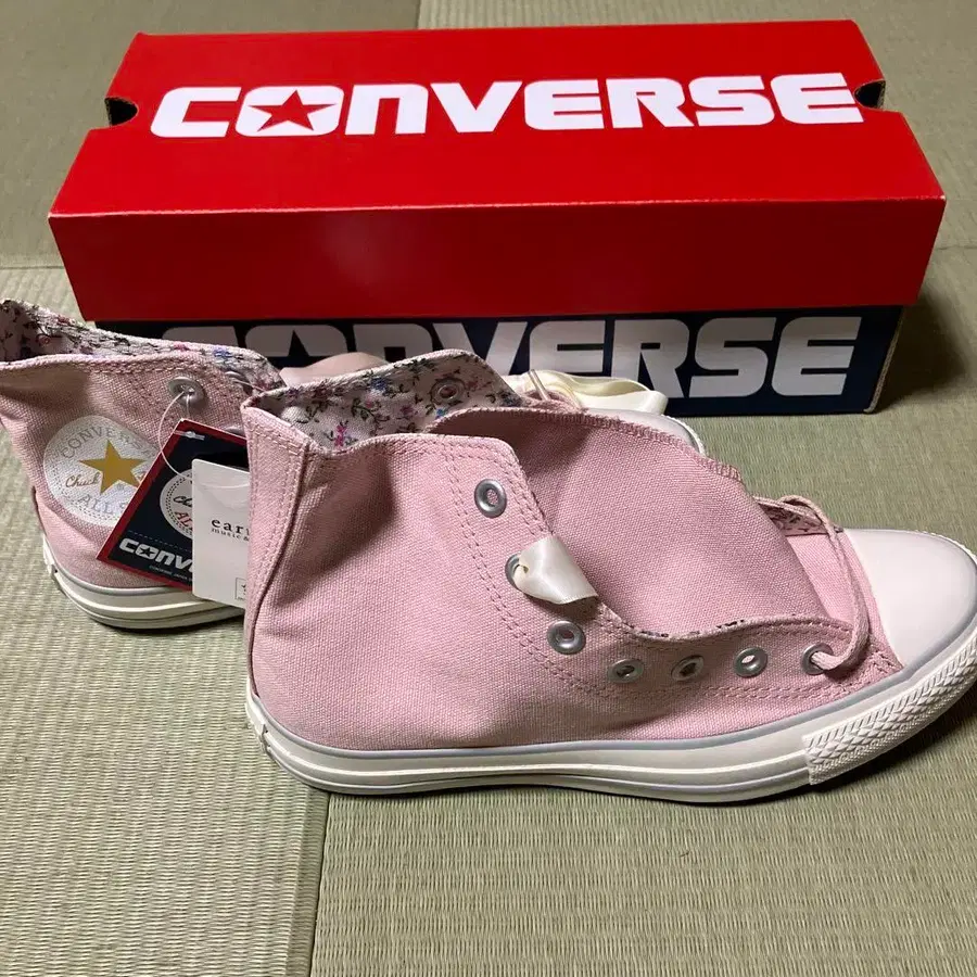 컨버스와 어스 뮤직&에코로 W 네임 하이컷 스니커즈입니다. 컬러: 핑크 pink 꽃무늬 안감 사이즈는 24.5cm, 미사용 새상품입니다. 동일 컬러의 끈과 화이트 리본이 부속물로 포함되어 있습니다.