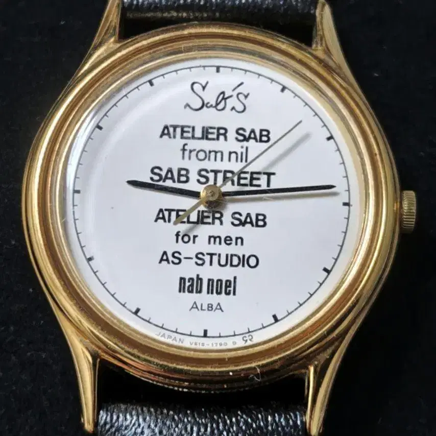 ATELIER SAB 아틀리에 서브 손목시계 빈티지 쿼츠 작동 중 레어 희귀 1990년대경 모델로 추정되는 빈티지 모델입니다!! 작동 중이며 새상품급, 절판 희귀 레어!! 세이코사 알바제. 신뢰의 일본제입니다!! 케이스는 골드 컬러 도금, 뒷면 커버는 스테인리스. 벨트는 가죽 벨트. ATELIER SAB 아틀리에 서브의 레터링 다이얼. 사이즈는 가로 약 32mm, 크라운 포함. 세로 약 38mm, 러그 미포함. 사이즈적으로 남녀 모두 착용 가능! 케이스, 벨트 모두 스크래치가 있지만 큰 흠집이나 찌그러짐은 없습니다. 유리도 약간의 스크래치 정도입니다. 중고품이므로 상태 등을 이해하신 후 구매해 주세요. 부속품은 없습니다.