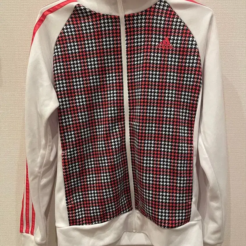 화이트와 레드의 하운드 투스 패턴 집업 자켓. - 브랜드: adidas - 색상: 화이트/레드/블랙 - 사이즈: XS - 디자인: 하운드 투스 패턴 - 스타일: 집업 자켓 - 특징: 사이드 스트라이프 방문해 주셔서 감사합니다.