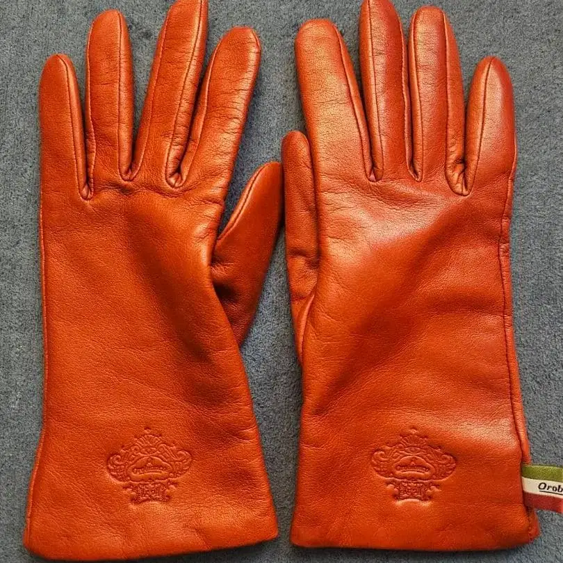 엠보싱 가공 로고가 들어간 오렌지색 가죽 장갑. - 색상: 오렌지 - 소재: 가죽 - 로고: 엠보싱 가공 로고 - 택: Orobi 사이즈 S 방문해 주셔서 감사합니다.