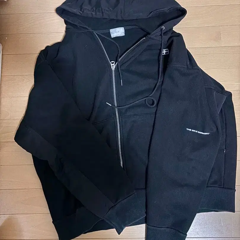 풀 집업 후드티와 허리밴딩 팬츠 세트.
