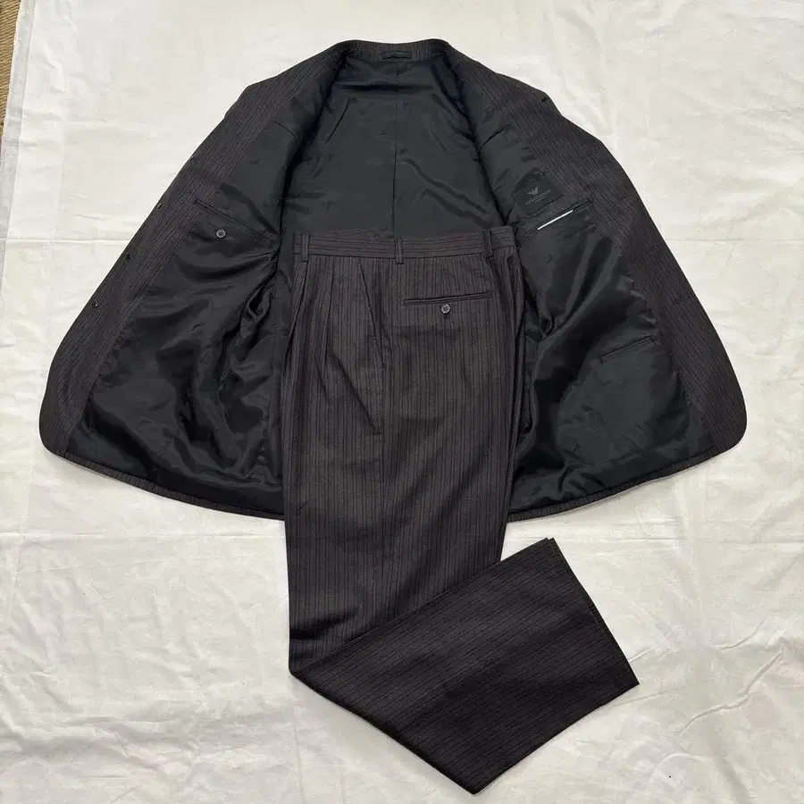 Giorgio Armani의 스트라이프 비즈니스 정장, 폴리에스테르와 울 혼합 소재로 쾌적한 착용감. - 브랜드: Giorgio Armani - 소재: 폴리에스테르 65%, 울 35% - 스타일: 스트라이프 - 사이즈: A-52 - 타입: 비즈니스 정장 방문해 주셔서 감사합니다.