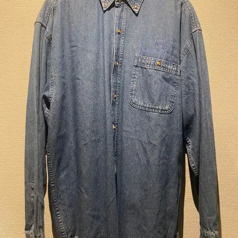 자동 번역되었어요. 원문보기데님 블루 버튼 다운 셔츠, 가슴 포켓 부착, 코튼 소재. 데님 셔츠 긴팔