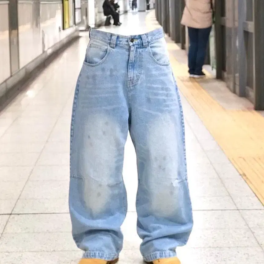 블루 와이드 레그 데님, 데미지 가공 있음.