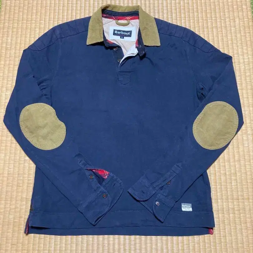 바버 트레이닝복 원단의 셔츠입니다. 코듀로이 엘보 패치가 부착되어 있습니다. 색상 – 네이비 사이즈 – M