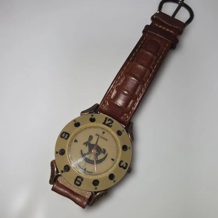 DEJUNO 빈티지 워치 Japan Movt 자택 보관품입니다. 배터리가 방전되었습니다. 도금에 변색이 있습니다. DEJUNO 로고와 달에 올라탄 토끼 그림이 그려진 쿼츠식 손목시계입니다. 검색 결과에 따르면, [DEJUNO]는 다양한 디자인의 빈티지 워치와 아트 워치를 제조했던 브랜드인 것 같습니다. 이 손목시계는 [Japan Movt]라고 기재되어 있으며, 일본제 무브먼트가 사용되었음을 나타냅니다. - 색상: 브라운 - 디자인: 아날로그 - 소재: 가죽 - 특징: 유니크한 다이얼 디자인 - 스타일: 캐주얼 방문해 주셔서 감사합니다.