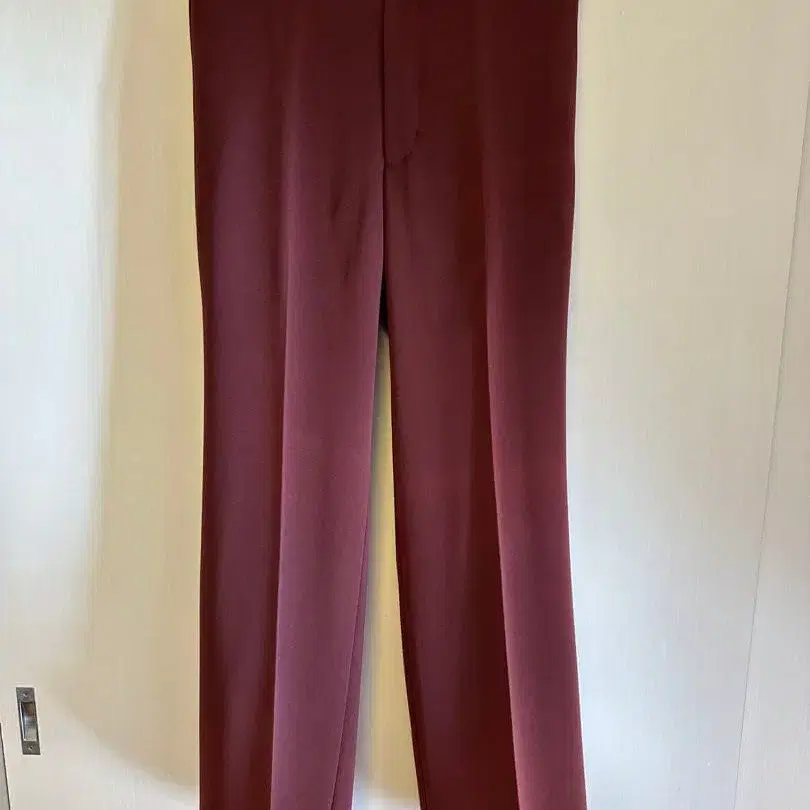 자동 번역되었어요. 원문보기버건디 컬러의 슬랙스, 사이드 버튼으로 스타일리시한 디자인.