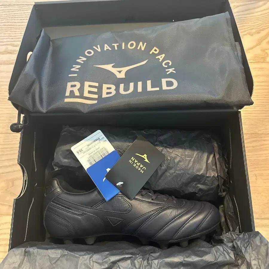 2025년 4월 25일(금) 출시. 새상품 미사용입니다. 아들의 예비용으로 온라인에서 구매했지만, 착용할 기회가 없었습니다. 그래서 한 번도 신어보지 않은 상태입니다. MIZUNO FOOTBALL의 플래그십 모델인 MORELIA II JAPAN을 베이스로, 엄선된 일본제 소가죽을 채용한 혁신 모델이 REBUILD PROJECT로 등장. 신발의 생명이라고도 할 수 있는 라스트에는 Engineered Fit Last를 채용. ■ 어퍼 특징: 엔지니어드 핏 라스트 ■ 신발 주머니 (중국산) 포함 ■ 천연 잔디/흙/인조 잔디 그라운드용 ■ 축구 스파이크 고정식 ■ 모렐리아 II JAPAN 탑 모델