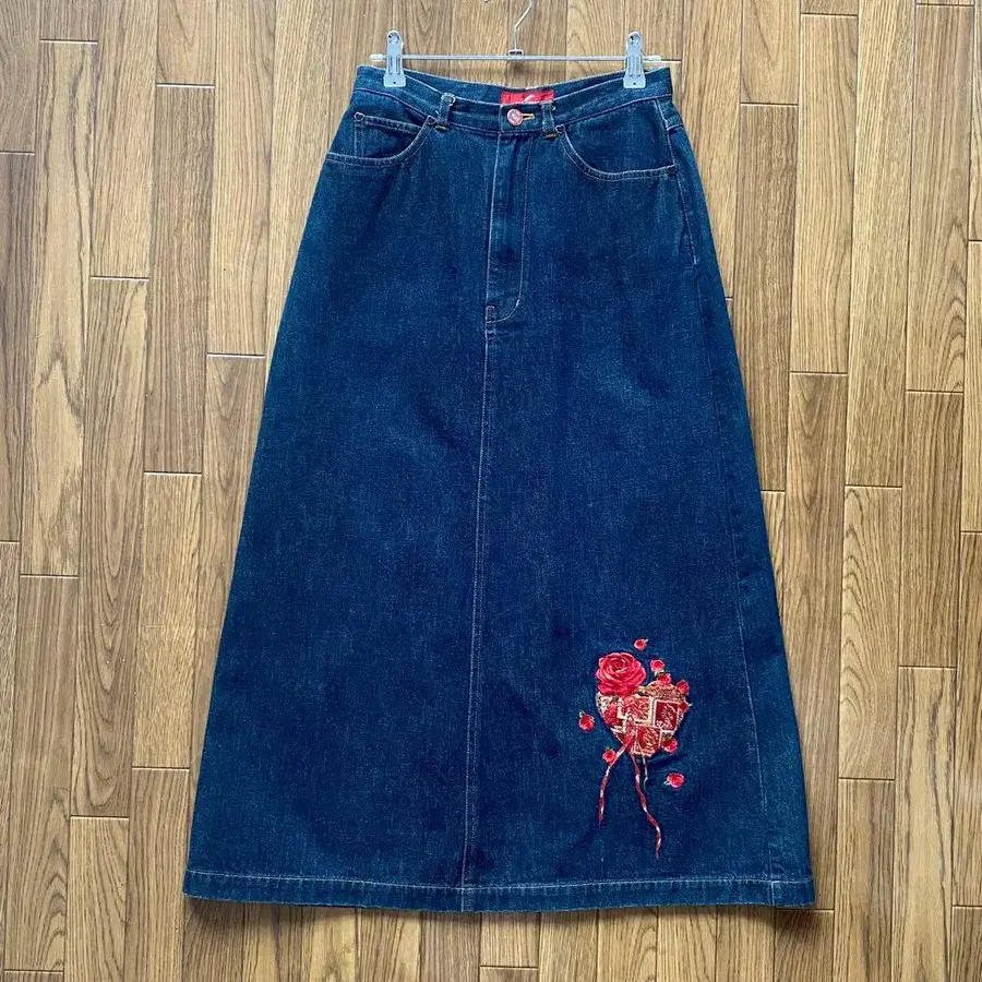 다크 데님에 장미와 하트 자수가 놓인 PINK HOUSE의 롱 스커트입니다. 실물은 데님 색상이 조금 더 차분합니다. 사진 6번째 장이 가장 비슷합니다. - 브랜드: PINK HOUSE - 디자인: 자수 디자인 - 색상: 다크 데님 레드 - 장식: 장미와 하트 자수 - 버튼: 로고 버튼 허리: 32cm 힙: 48cm 총장: 84cm 방문해 주셔서 감사합니다.