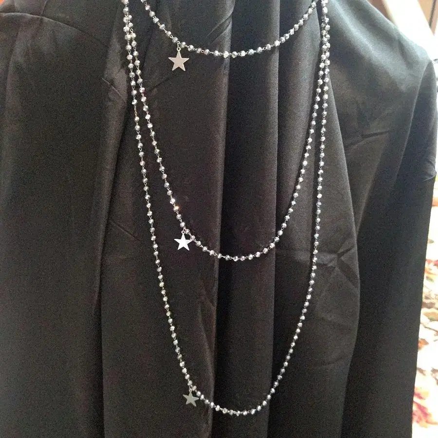 star charm necklace 별 모양 참 3개 달린 롱 목걸이 미러볼 체인으로 된 3개 롱 목걸이. 길이가 다른 체인에는 각각 별 모양 참이 달려 있습니다. 이미지로는 잘 보이지 않지만 상당히 반짝입니다. 검은색 의류에 매치하면 돋보입니다. - 소재: 금속제 - 색상: 실버 - 목둘레 약 45cm 사용 빈도 적은 새상품급이지만 미세한 작은 흠집 등이 신경 쓰이는 분은 구매를 자제해주세요. 방문해 주셔서 감사합니다. #pk액세서리